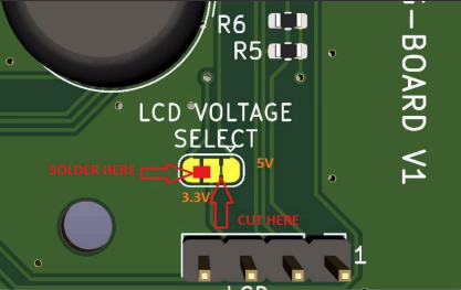 However, if using a 3.3 V LCD display, the voltage selection jumper must be modified: