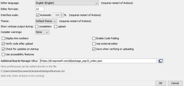 This enables Arduino IDE to download and install ESP32 board definitions.
