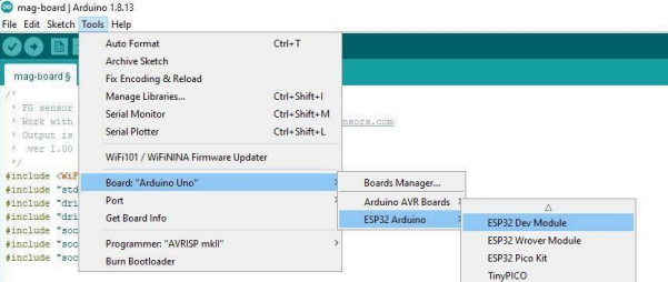 The MAG-BOARD uses an ESP32-based controller, so you must install ESP32 board support in Arduino IDE.
